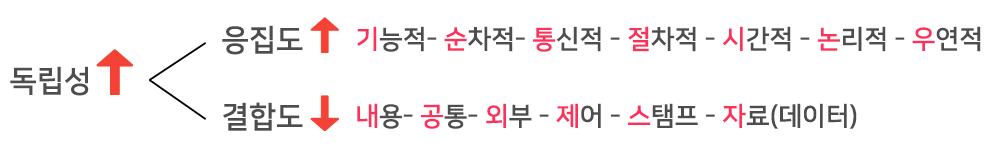 | 모듈구현 1. 단위모듈구현 1) 공통모듈 - 전체시스템 설계를 할 때에 각각의 서브 시스템에서 공통으로 사용되는 모듈을들 하나로 묶어서 놓은 소프트웨어 라이브러리를 말한다. 2) 단위모듈 3) 모듈화 - 모듈의 독립성이 높아야 모듈화가 잘 되었다고 평가할 수 있다. ![]() - 결합도 두 모듈간의 상호 의존도 - 응집도 한 모듈 내에 있는 처리 요소들 사이의 기능 적인 연관정도를 나타내며, 응집도가 높아야 좋은 모듈이 왼다. 2. 단위 모듈 테스트 1) 시험단계에 의한 분류 => 순서 ((단위)모듈 → 통합 → 시스템 →인수) - 모듈 시험 (단위) : 독립적인 환경에서 하나의 모듈만을 테스트 ** 각 각의 모듈 시험 - 통합 시험 : 시스템 모듈간의 상호인터페이스에 관한 테스트, 즉 모듈간의 데이터 이동이 원하는 대로 이루어지는가 확인 ** 하향식, 상향식 통합 - 확인시험 - 시스템 시험 2)시험 방법에 의한 분류 - 블랙박스 시험 : 소프트웨어 외부명세서 기준으로 그 기능, 성능 테스트 = 기능시험, 데이터위주(Data-Driven) 시험, 입출력 위주(IO-driven) 시험 = 1. 동등분할 2. 경계값분석, 3 원인-결과 그래프 기법 - 화이트박스 시험 : 소프트웨어 내부의 논리적 구조 테스트 =프로그램 내의 모든 논리적 구조를 파악하거나, 경로들의 복잡도를 계산하여 시험사례를 만든다. =복잡도 : 프로그램의 논리적 복잡도를 수량(Quentative)적으로 측정하는 소프트웨어 측정법(SW Metrics) V(G) = E - N + 2 (E : 간선의 수 , N : 노드의 수) V(G) = P - 1 (P : 분기 node수) |