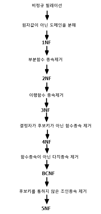 | 관계 데이터베이스 정규화 1. 정규화 개념 개념 - 이상문제를 해결하기위해 어튜리뷰트 간의 종속 관계를 분석하여 여러개의 릴레이션으로 분해하는 과정 - 논리적 설계 단계에서 수행 - 정규화를 통해 릴레이션 분해하면 일반적으로 연산시간 증가 ** 성능 하향 목적 - 데이터베이스 연산의 여러 이상을 없애기 위함 anomaly(이상) - 어튜리뷰트 간에 존재하는 여러 종속 관계를 하나릐 릴레이션에 표현함으로 인해 발생하는 현상 (삽입이상, 삭제이상, 갱신이상) 삽입이상 = 데이터 삽입시 원하지 ㅇ낳는 정보를 강제 삽입해야 하는 경우와 불필요한 데이터가 함께 삽입되는 경우 삭제이상 = 튜플을 삭제함으로써 유지되어야 하는 정보까지도 연쇄삭제되는 이상 갱신이상 = 중복된 튜플중에서 일부의 attribute만 갱신 시킴으로써 정보의 모순성이 생기는 현상 스키마변환의 원리 정보의 무손실, 데이터 중복성 감소, 분리의 원칙, 종속성 보존 함수적 종속(functional dependency : FD) - 어떤 릴레이션에서 속성들의 부분 집합을 X, Y라 할때, 임의 튜플에서 X의 값이 Y의 값을 함수적으로 결정한다면, Y가 X에 함수적으로 종속되었다고 하고, 기호로는 X -> Y로 표기한다. 2. 정규화 체계 제 1정규형(1NF) 어떤 릴레이션 R에 속한 모든 도메인이 원자값(atomi value)만으로 되어 있다면 제1정규형에 속한다. 제 2정규형(2NF) 어떤 릴레이션 R이 1NF이고 키(기본)에 속하지 않은 애트리뷰트는 모두 기본키의 완전함수종속이면, 제 2정규형이다. 제 3정규형(3NF) 어떤 릴레이션 R이 2NF이고 키(기본)에 속하지 않은 모든 애트리뷰트들이 기본키에 이행적 함수종속이 아닐때 제 3정규형에 속한다. 보이스/코드 정규형(BCNF) 릴레이션 R의 모든 결정자(determinant)가 후보키(candidate key)이면 릴레이션 R은 보이스/코드 정규형에 속한다. 제4 정규형(4NF) 릴레이션에서 다치종속 관계가 성립하는 경우 제5 정규형(5NF) 릴레이션에서 조인종속이 성립하는 경우 정규화 과정 ![]()