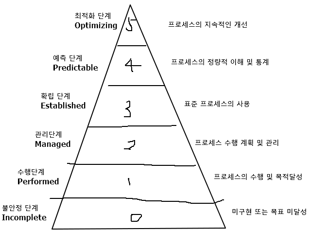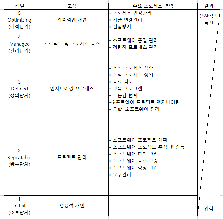 | 국제 표준 제품 품질 특성 1. IOS/IEC 9126 2. CMM(Capability Maturity Model) - 소프트웨어 조직이 높은 품질의 소프트웨어를 일관성 있고 예측 가능하게 생산 할 수 있는지의 능력을 정량화 하는 시도이다.(개발 경험의 성숙도에 따라 5개 수준으로 나누고 각 수준별로 기본적으로 해야 할 관리 활동과 프로세스를 정의) CMM 목적 - 조직의 소프트웨어 개발 체계의 구축, 발전 및 유지보수 능력을 지속적으로 향상시키고 위험요소를 최소화 시키고 교육시키는 것이다. CMM성숙도 5단계 ![]()