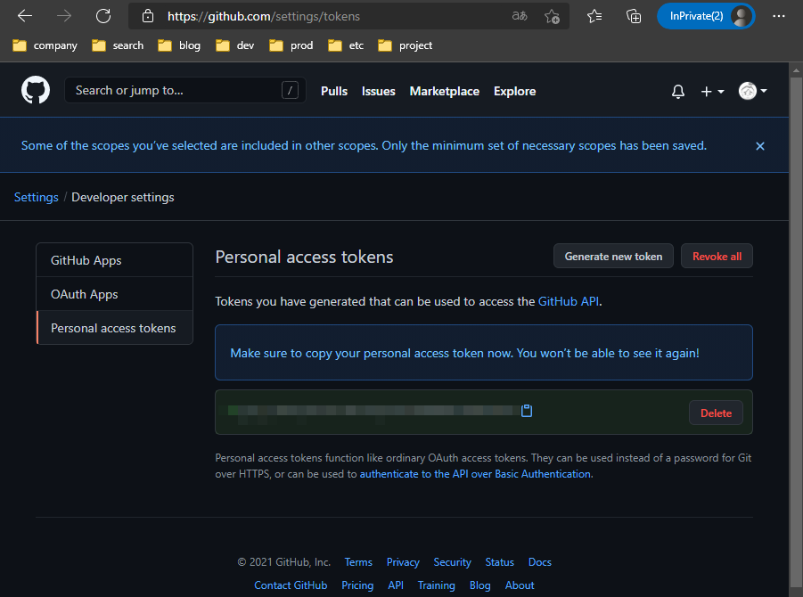 만들어주면 토큰생성 되었습니다. 토큰위에 영어보면 아시겠지만 다시볼수 없으니까 복사해두라고 합니다.