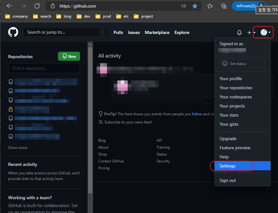 https://github.com/ 사이트에 로그인한후 우측 상단에 프로필 클릭하면 세팅나옴 클릭하시고